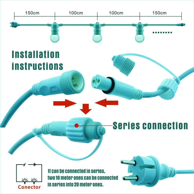 Câble de guirlande lumineuse conçu pour l'éclairage extérieur, équipé de 10 douilles E27 pour apporter une touche d'illumination et d'embellissement à vos patios, terrasses, pergolas, bars, restaurants ou événements en plein air. Il offre la possibilité de métamorphoser chaque recoin en un espace à la fois charmant et unique.