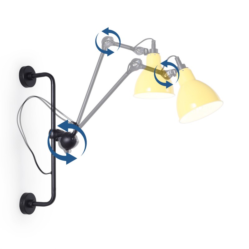 • Format articulé : elle dispose d'une structure fixe pour la fixation au mur et d'un bras articulé avec trois points de réglage qui permettent d'incliner les pièces et l'abat-jour. La partie la plus longue est orientable à 360°.