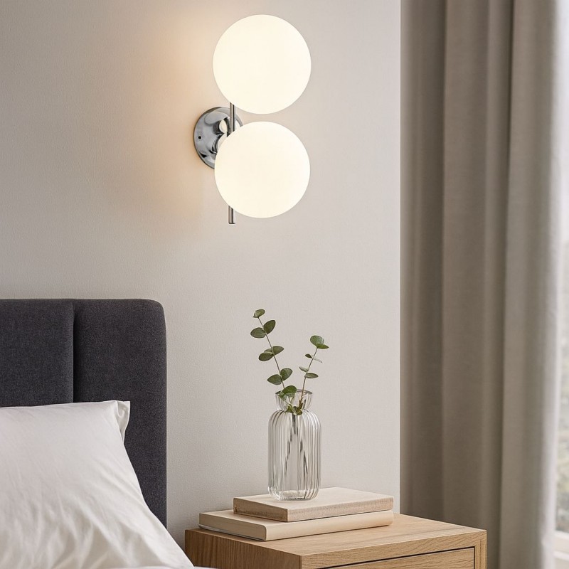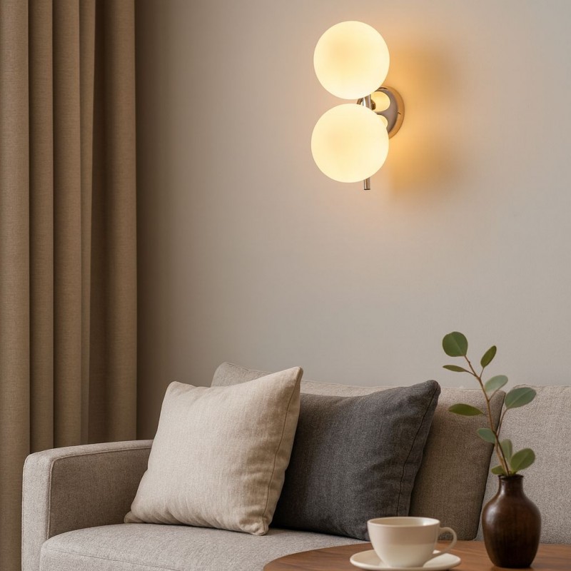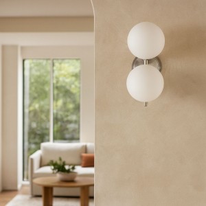 - Design minimaliste: Composée de deux sphères en verre opalin posées en équilibre sur une structure en aluminium chromé ou doré, elle s'adapte parfaitement aux intérieurs classiques, rétro ou modernes.