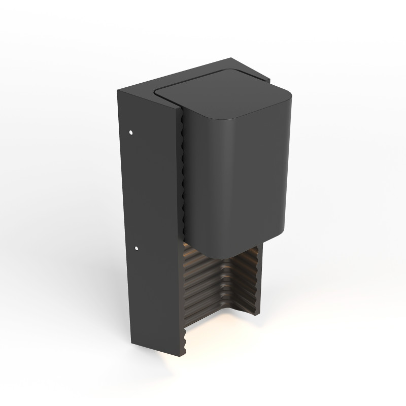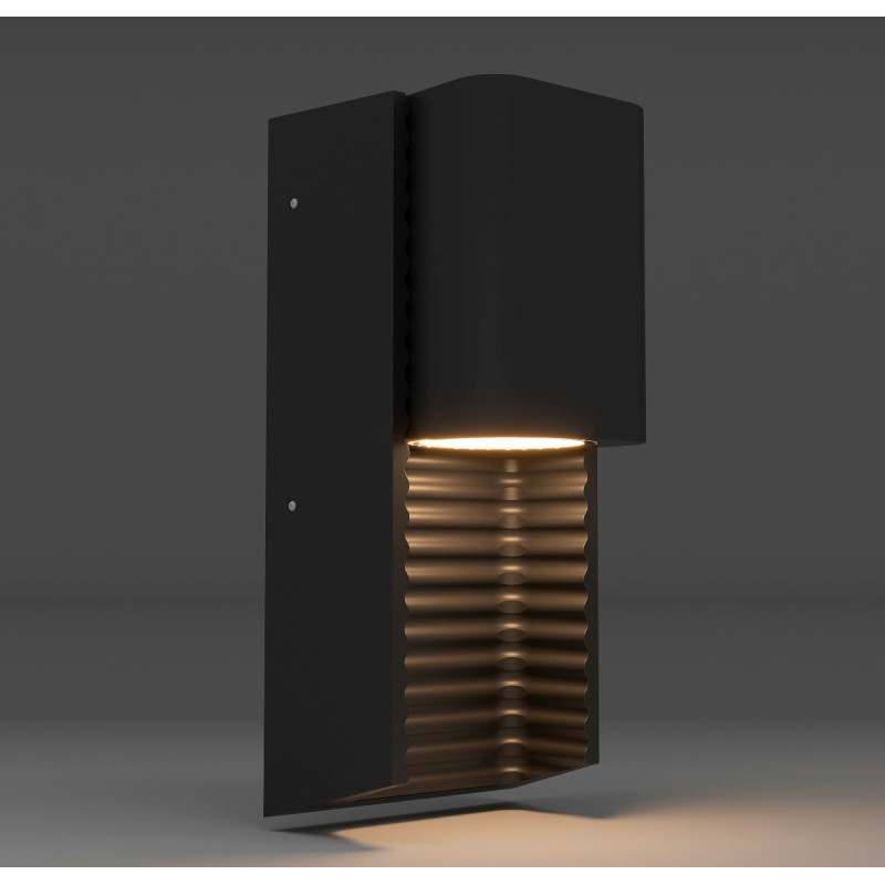 L'applique extérieure "WINNIE" combine un diffuseur en verre avec une structure en aluminium sur une finition noire mate. Elle intègre une texture créant un effet original lorsqu'elle est allumée.