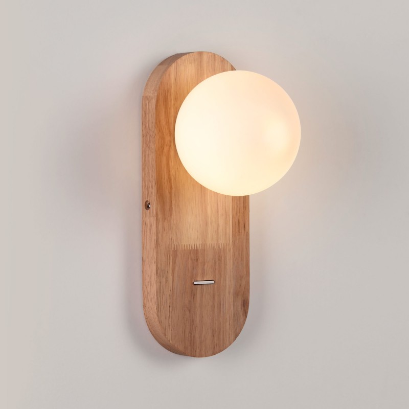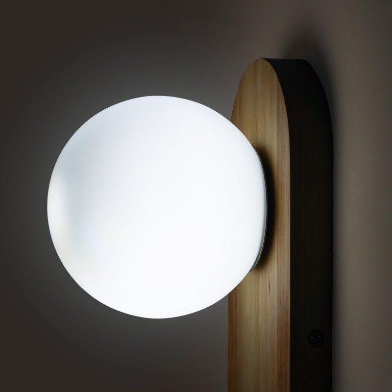 Applique murale minimaliste "SOMA", composée d'une sphère en verre opale et d'une base en bois dans des tons clairs ou foncés.