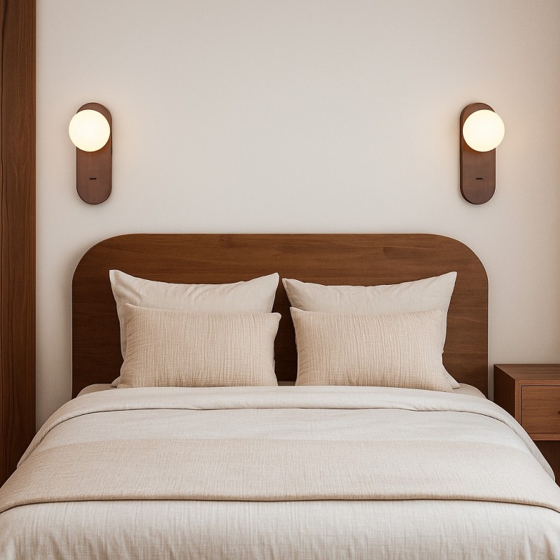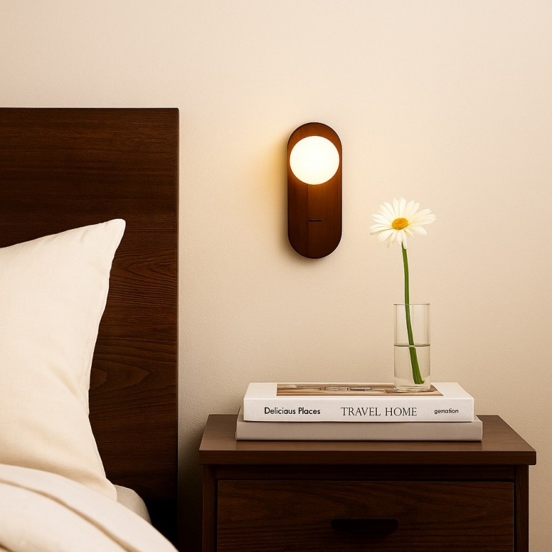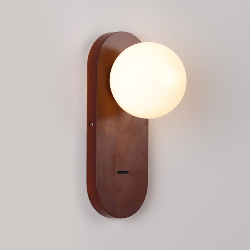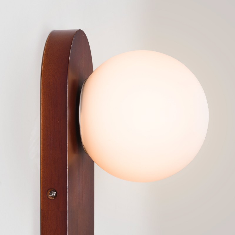 Applique murale minimaliste "SOMA", composée d'une sphère en verre opale et d'une base en bois dans des tons clairs ou foncés.