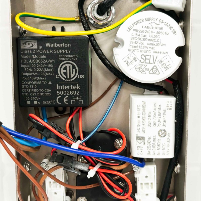 Elle dispose d'un spot LED frontal de 3W et d'un éclairage indirect arrière de 12W en blanc chaud. Chaque système d'éclairage est contrôlé indépendamment par deux interrupteurs intégrés.