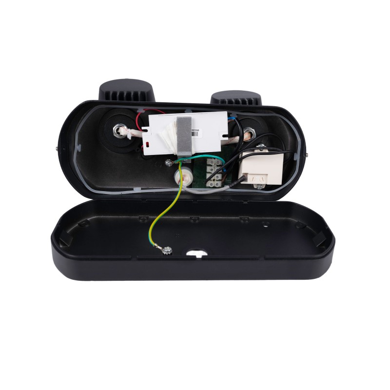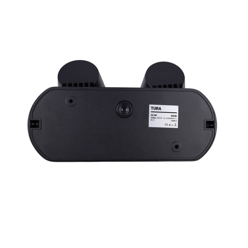 L'applique LED d'extérieur "Tura" présente deux abat-jours en aluminium à la finition noire mate, orientables pour s'adapter aux besoins spécifiques de chaque espace. Chaque abat-jour est également équipé d'un diffuseur en polycarbonate opale, garantissant une diffusion douce et uniforme de la lumière.