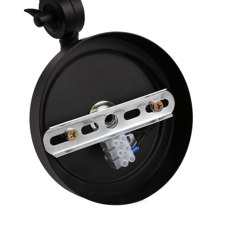 L’installation est simple : il suffit de réaliser les connexions électriques, puis de les recouvrir avec la base métallique, qui se visse au mur. Tous les accessoires nécessaires à l’installation sont inclus.