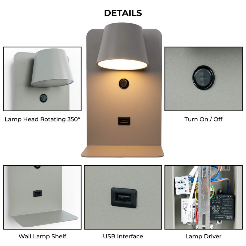 Lot x 2 - Liseuse murale avec port USB "Baskop" - Design polyvalent - Gris
