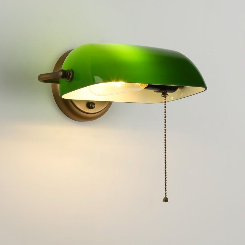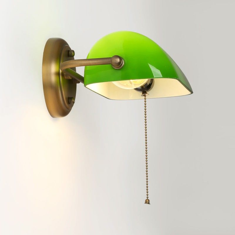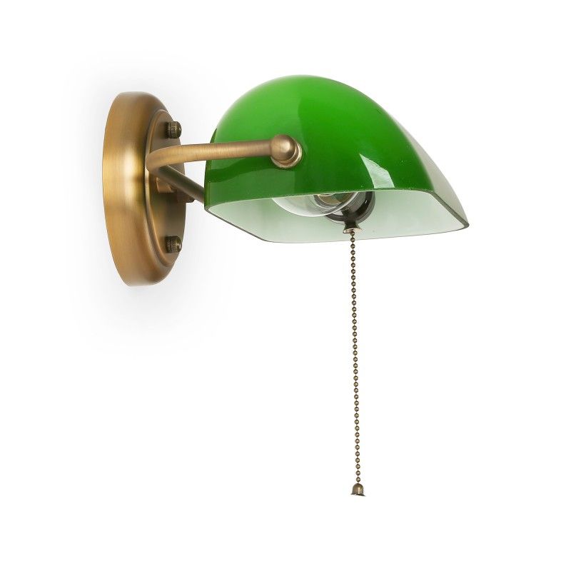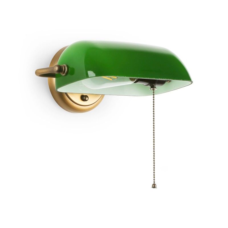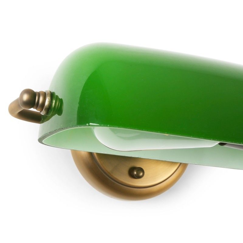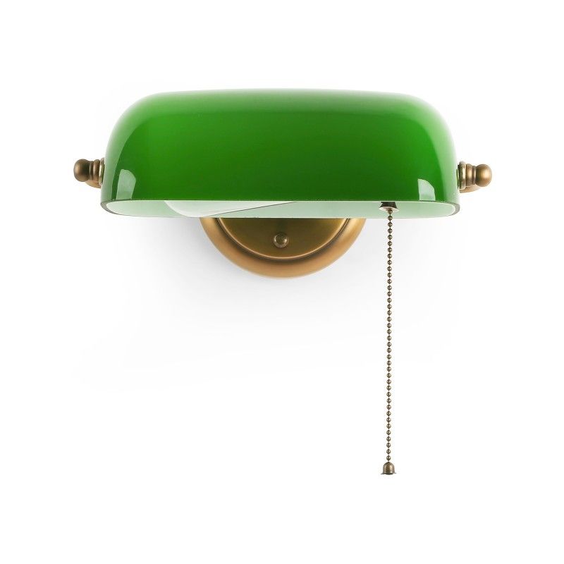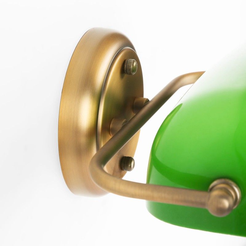Applique vintage "BANQUERO", avec un abat-jour en verre orientable disponible en vert et blanc et une élégante base en laiton antique.