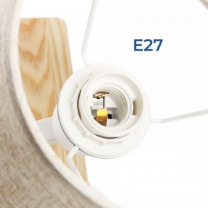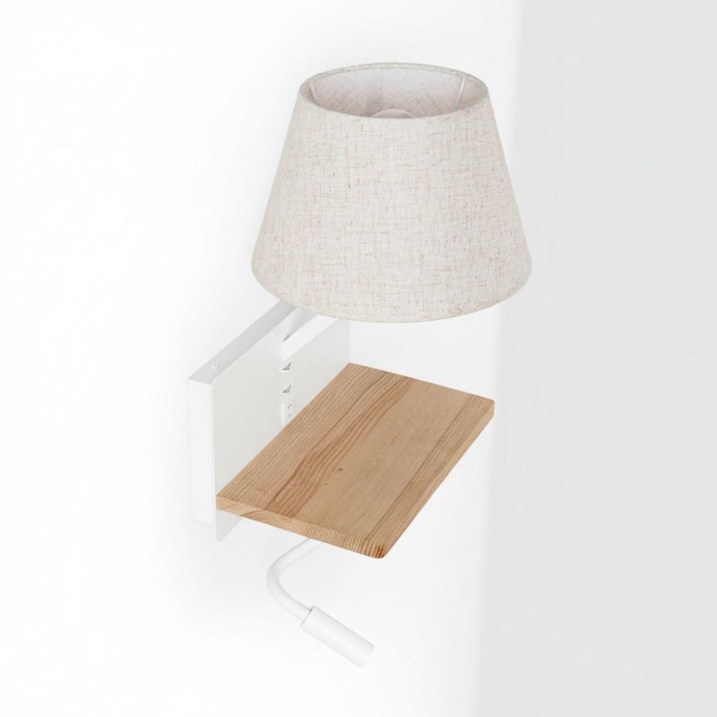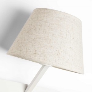 Elle se compose d'une base en aluminium laqué blanc, d'un élégant abat-jour en tissu beige et d'une tablette en bois naturel.