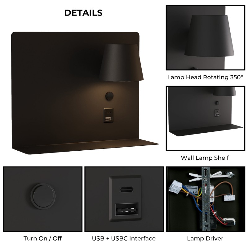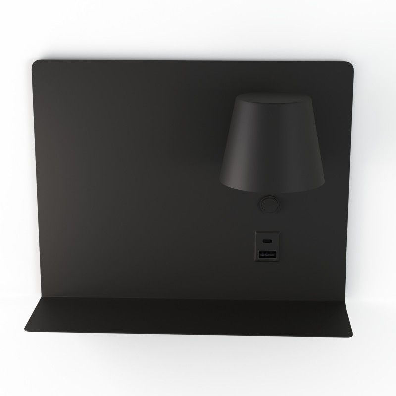 Applique moderne spécialement conçue pour être installée dans les têtes de lit, avec port USB et USBC et étagère intégrée.