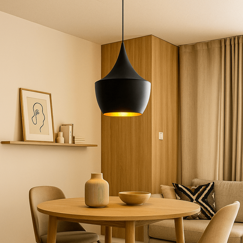Son abat-jour en aluminium affiche une finition mate disponible en banc et noir, tandis que son intérieur doré crée un effet lumineux captivant lors de l'allumage, en faisant véritablement un accroche-regard.