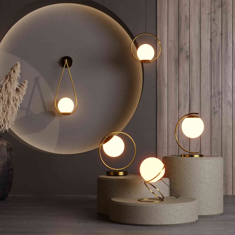 - Design sophistiqué : elle est composée d'une élégante structure incurvée en aluminium, finition or mat, et d'une sphère en verre opale à haute transmission lumineuse.