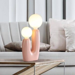 Cette lampe de table, aux lignes simples et au design unique, se démarque par ses deux abat-jour, l'un haut et l'autre bas, révélant une harmonie entre différentes personnalités. Ces abat-jours sont élégamment reliés par une base en résine en forme de U, créant ainsi une pièce unique.