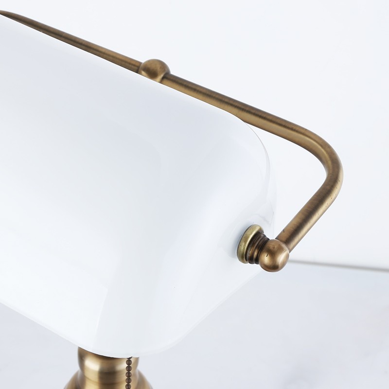 Notre version de la lampe banquier est bien plus légère que l'originale grâce à l'utilisation d'un matériau effet « laiton vieilli », et diffuse une agréable lumière verte très homogène grâce aux finitions exceptionnelles de son abat-jour en verre laqué. Le pied est matelassé et lesté afin d'en garantir la stabilité et d'éviter de rayer votre mobilier.