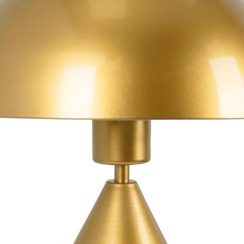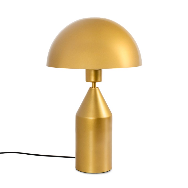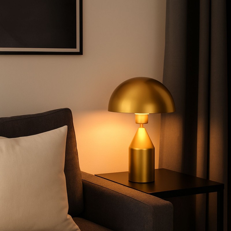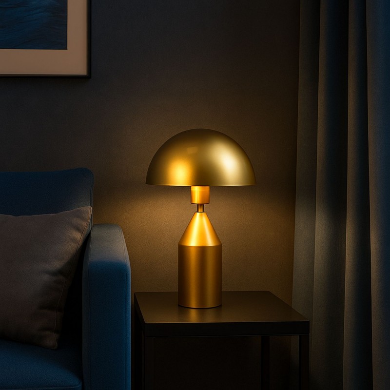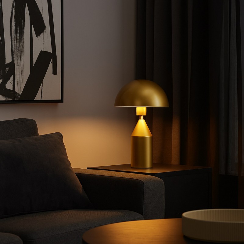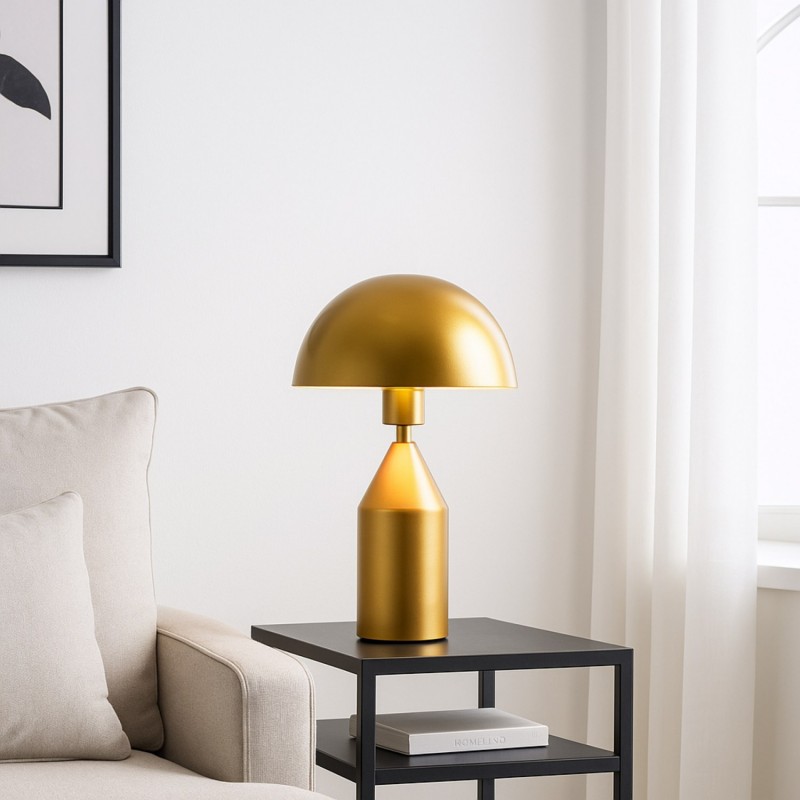 Arborant un design vintage et géométrique, cette lampe champignon se distingue par son pied cylindrique et son abat-jour hémisphérique, créant ainsi une esthétique captivante.