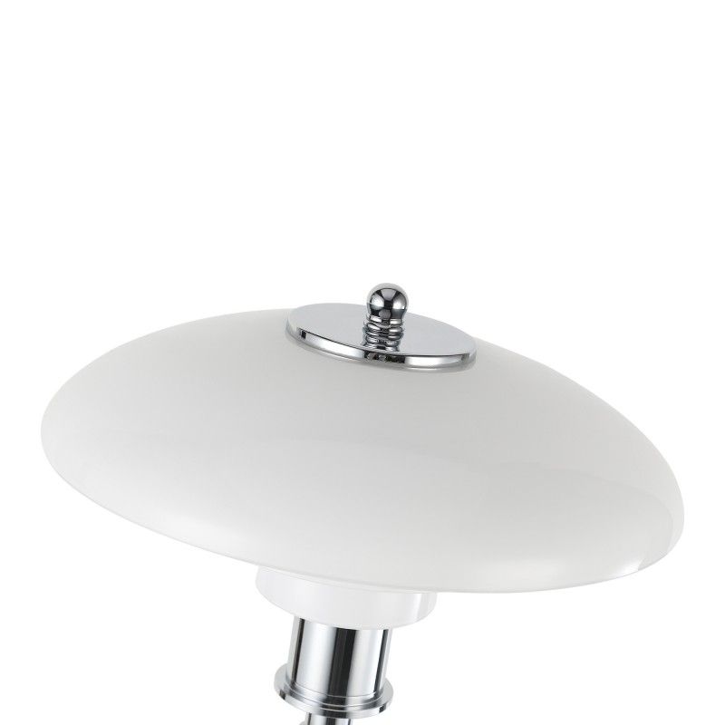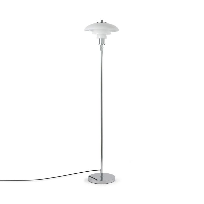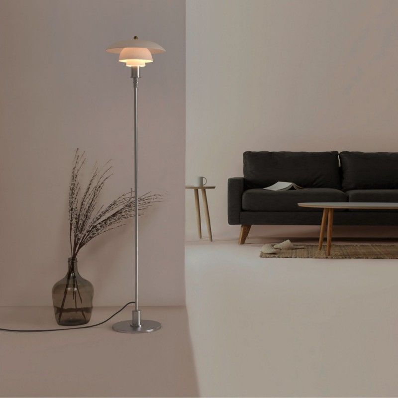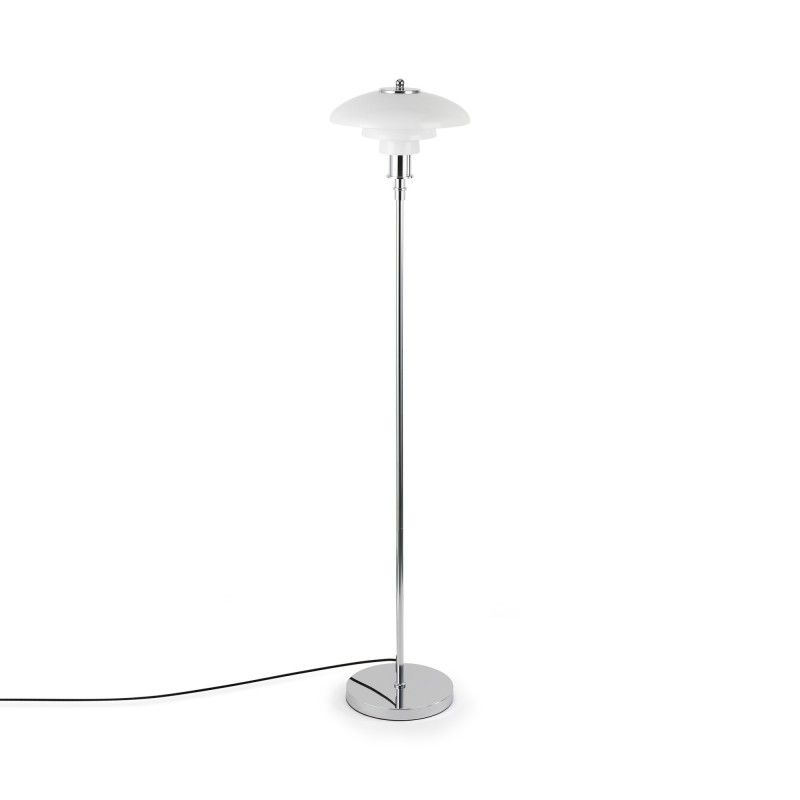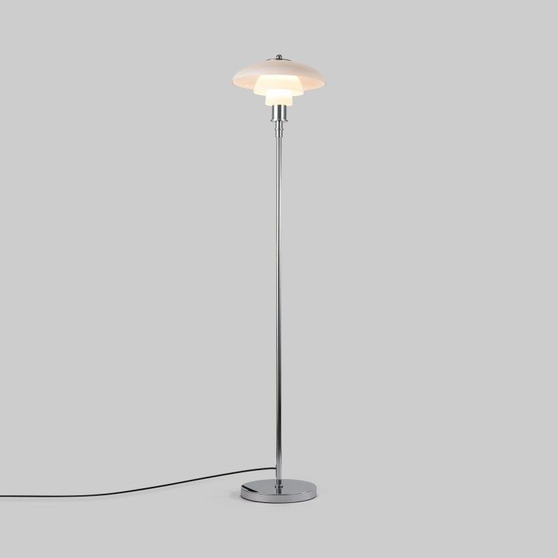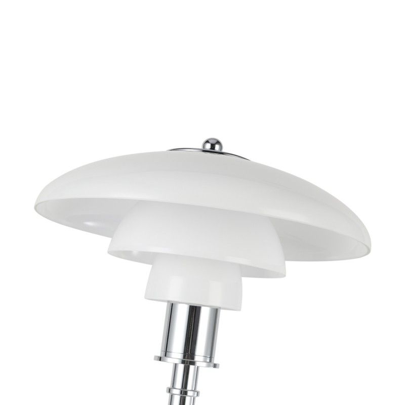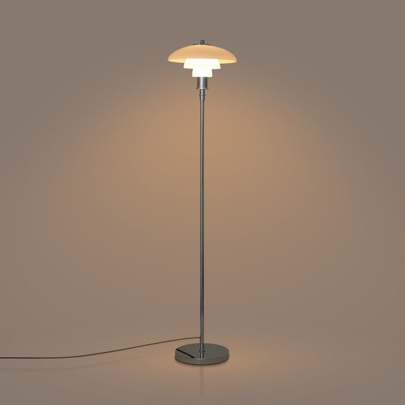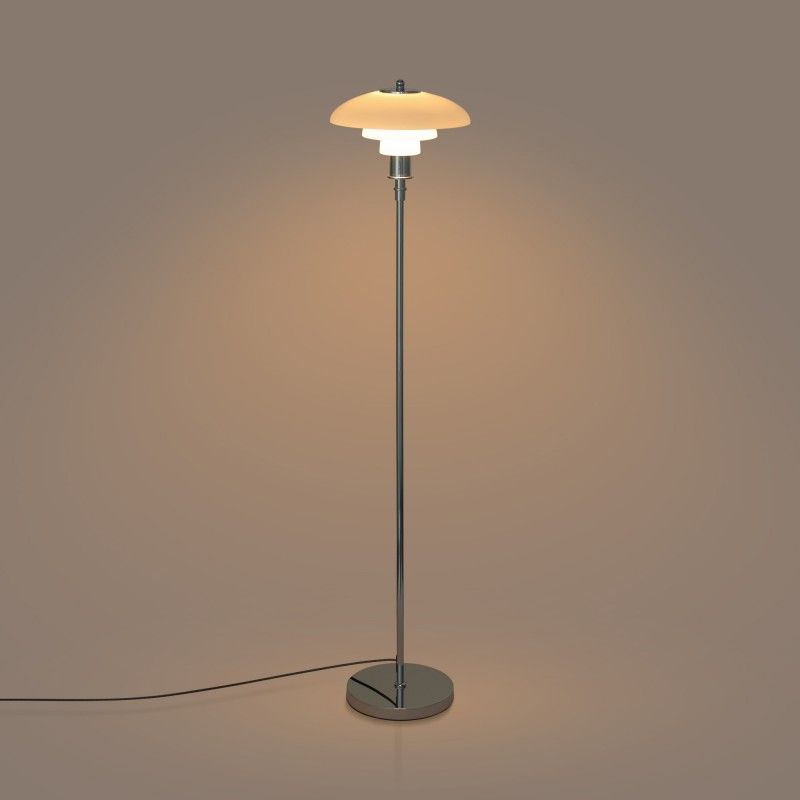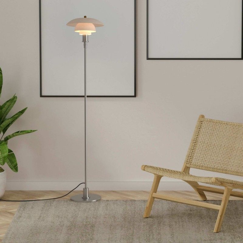 Lampe sur pied au design raffiné avec triple abat-jour en verre opale et détails en aluminium, disponible en finition dorée ou chromée.