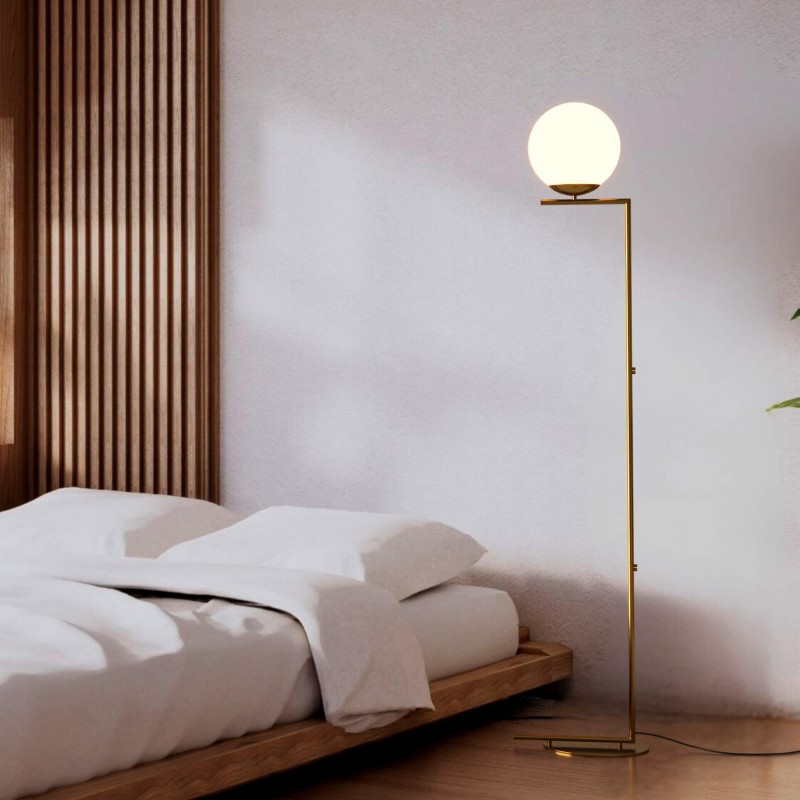 Découvrez l'élégance du lampadaire "Anni" avec sa structure en aluminium doré mat et son abat-jour sphérique en verre opale à haute transmission lumineuse, cette lampe offre un éclairage lumineux et uniforme qui se démarque dans tous les environnements.