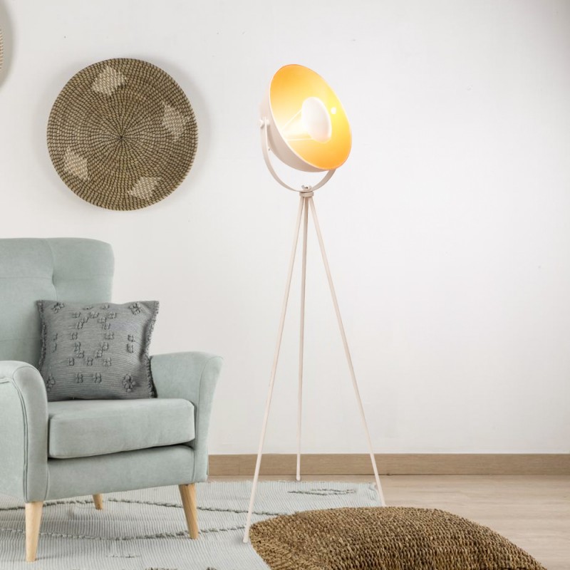 Lampe sur pied avec trépied au design vintage, inspirée des anciennes lampes des studios photographiques.