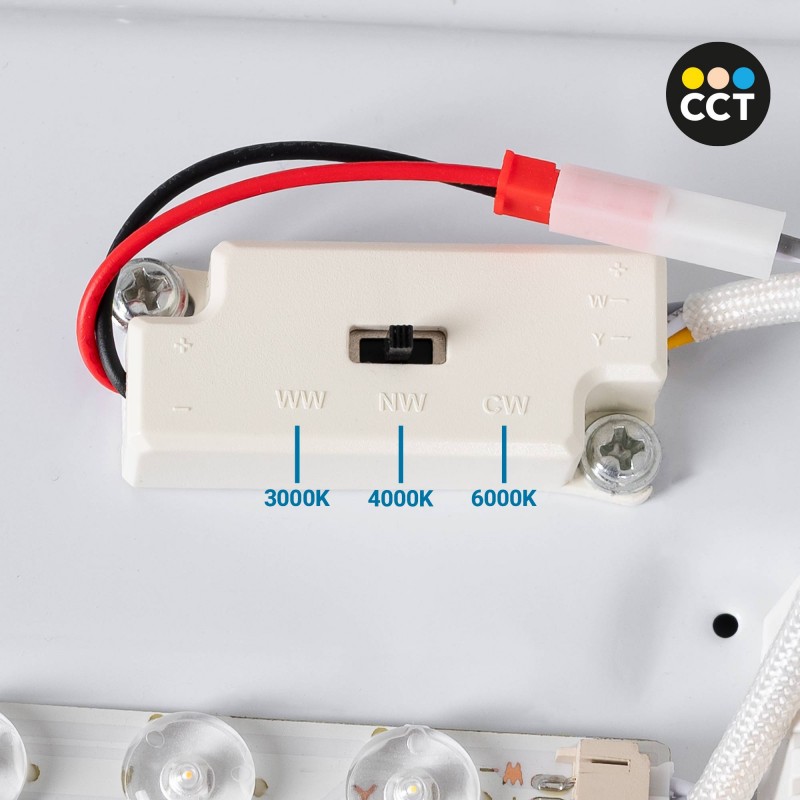 - Teinte réglable : Système CCT pour le réglage de la température de couleur entre : blanc chaud (3000K), blanc neutre (4000K) et blanc froid (6000K).