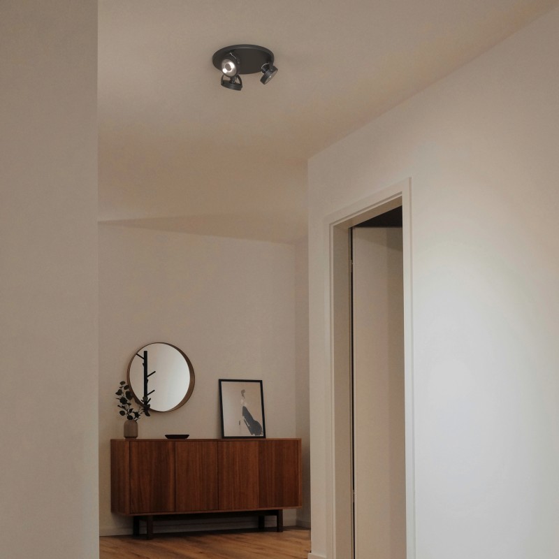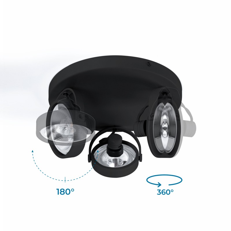 Plafonnier 3 spots au look très moderne et aux prestations de qualité, à installer au mur ou au plafond. Chacun de ses 3 spots AR111 (culot GU10) est ajustable pour un éclairage sur mesure.