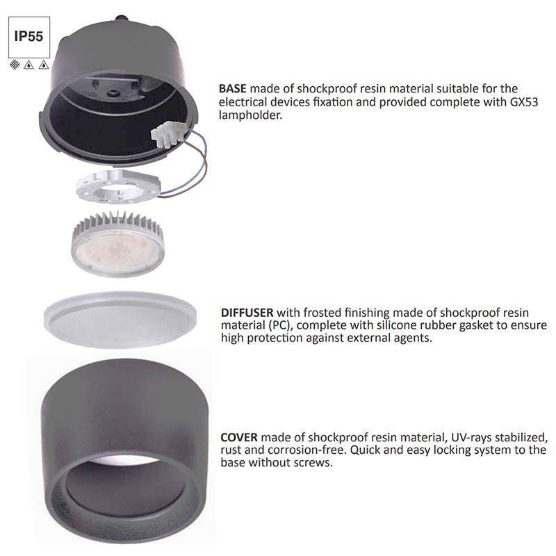 Il est équipé d'un diffuseur en polycarbonate dépoli et intègre une ampoule GX53 CCT remplaçable, offrant une longue durée de vie et des performances lumineuses élevées.