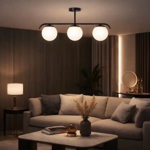 Le plafonnier « Talí » est doté d’une structure en métal reliée à un pavillon central et de trois abat-jour sphériques en verre opalin à haute transmission lumineuse, offrant un éclairage brillant et homogène.