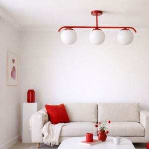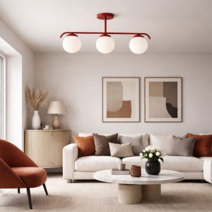 Le plafonnier « Talí » est doté d’une structure en métal reliée à un pavillon central et de trois abat-jour sphériques en verre opalin à haute transmission lumineuse, offrant un éclairage brillant et homogène.