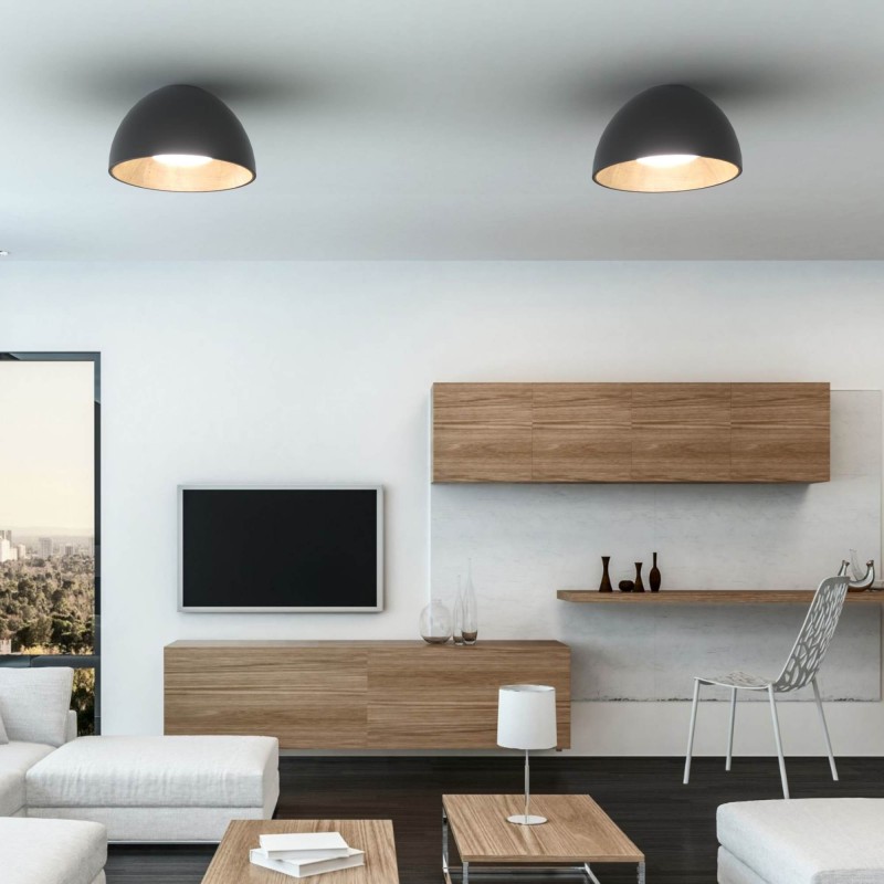 Le plafonnier LED se compose d'une structure en aluminium, disponible en finition noire ou blanche, avec un intérieur couleur bois et un diffuseur central en polycarbonate. Son design est moderne, élégant et en accord avec les dernières tendances décoratives.