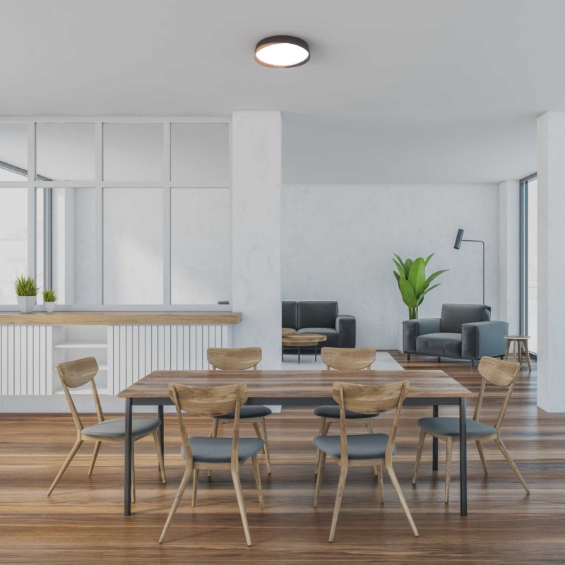 Notre luminaire de plafond LED au design moderne et élégant s'intègre parfaitement dans tous les environnements. Disponible en polycarbonate avec des finitions noires et blanches, il est rehaussé de détails à effet bois pour une touche de sophistication.