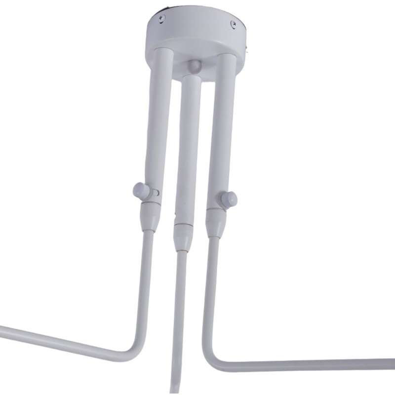 Les bras de cette lampe s'étendent à partir d'un point central, formant une rosace de plafond où se trouve le mécanisme de suspension. Ces bras se ramifient ensuite dans différentes directions, permettant une distribution équilibrée et enveloppante de la lumière.