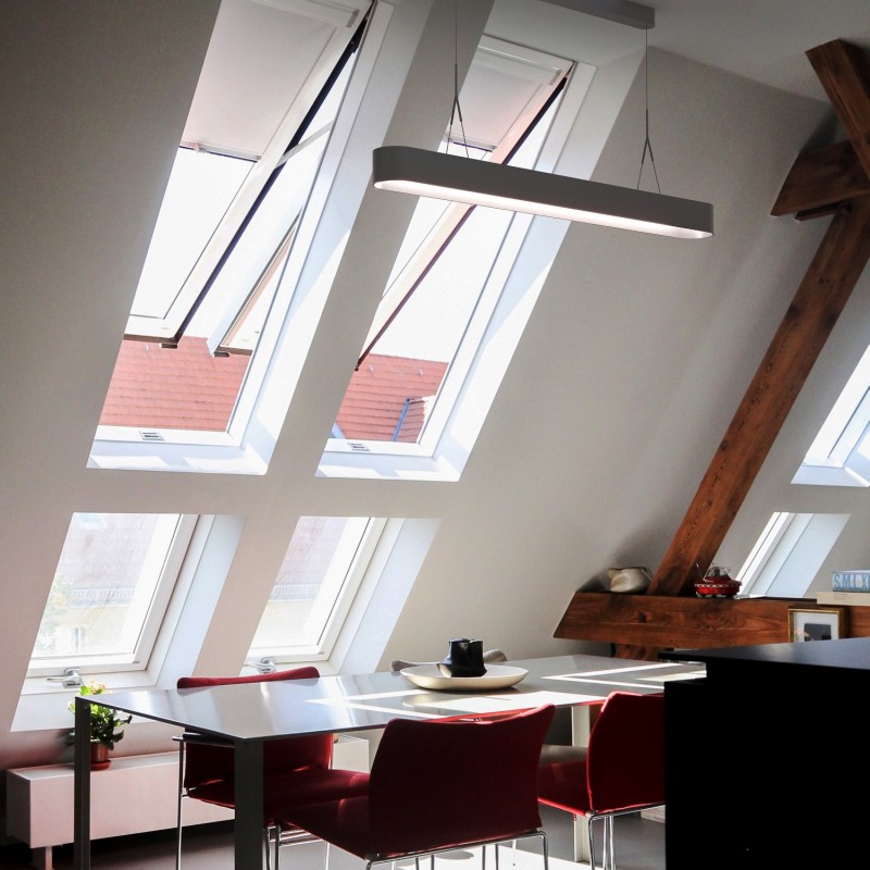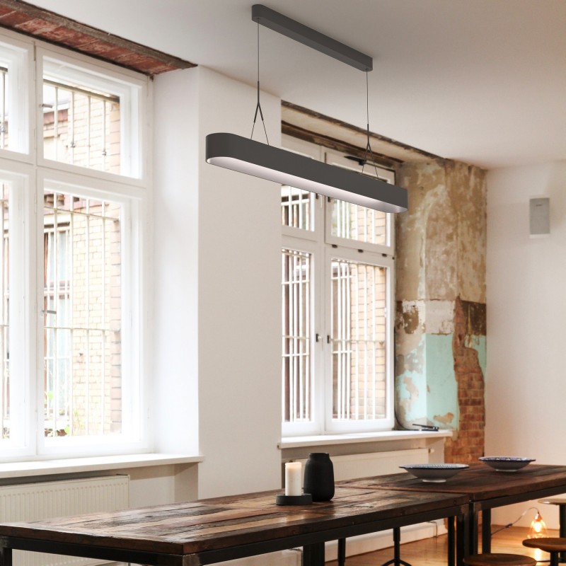 Cette suspension fournit un éclairage agréable et puissant qui est diffusé depuis l'intérieur de la lampe, évitant l'éblouissement. Elle est particulièrement adaptée aux grands espaces ou aux plafonds élevés grâce à son ajustement en hauteur allant jusqu'à 1,3 mètre.