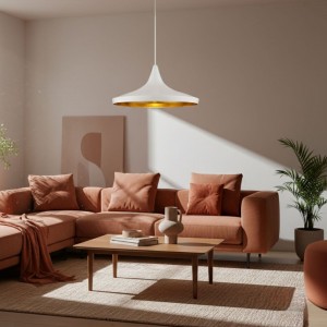 Elle dispose d’un abat-jour en aluminium au fini mat, disponible en blanc ou en noir, avec un intérieur doré.