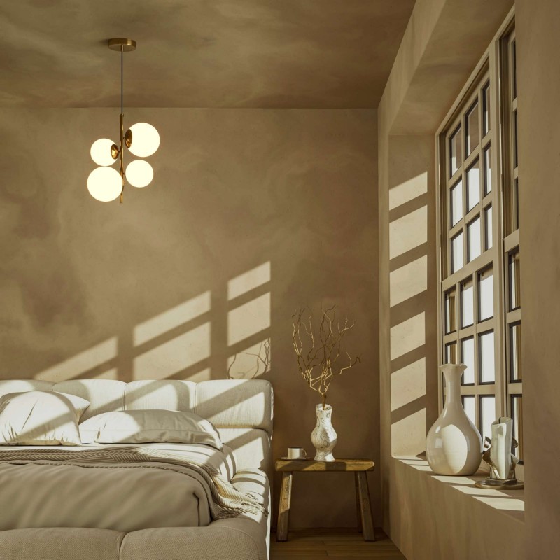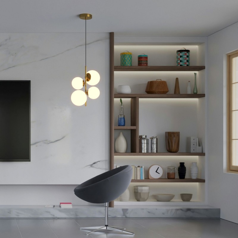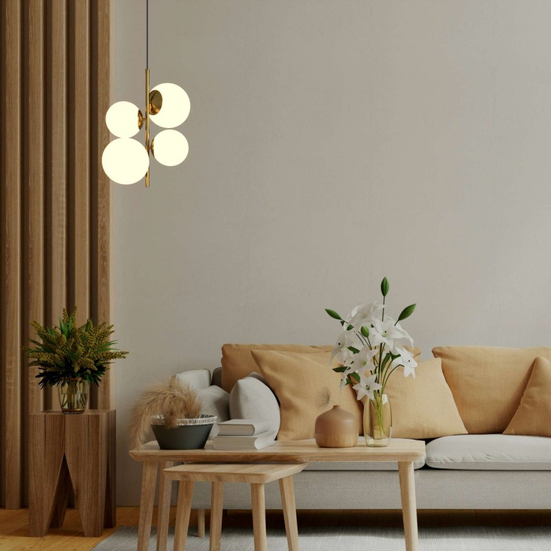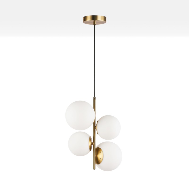 • Design minimaliste: Avec ses 4 sphères en verre opale et sa structure en aluminium aux finitions dorées ou chromées, cette lampe s'adapte parfaitement aux intérieurs de différents styles décoratifs.