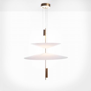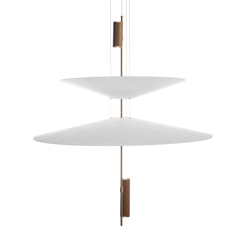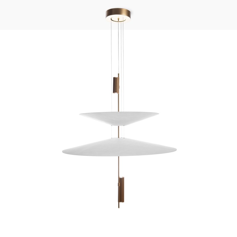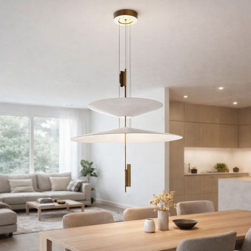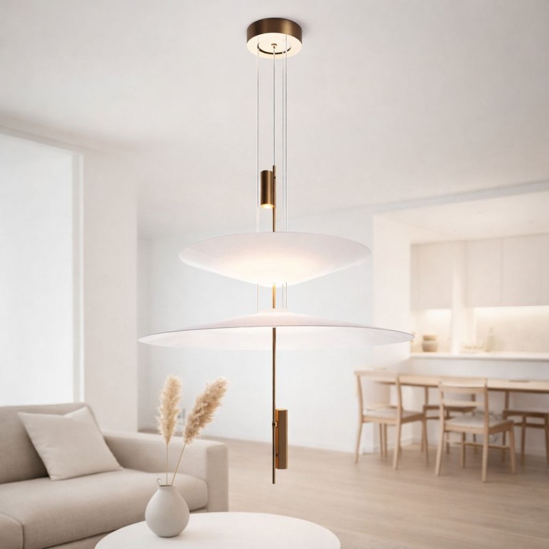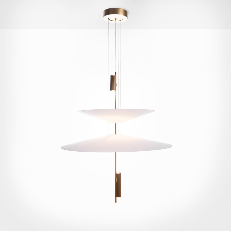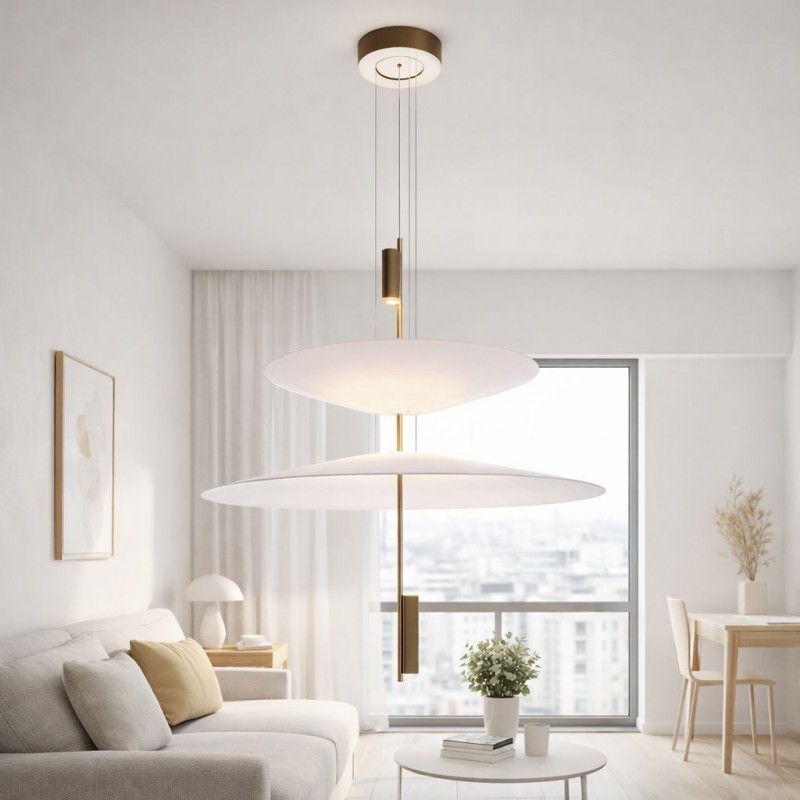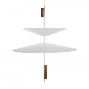 Cette lampe se distingue par son design architectural formé par des disques suspendus qui semblent flotter dans l'espace et qui, avec les spots LED intégrés, créent un éclairage précis, enveloppant et visuellement très léger.