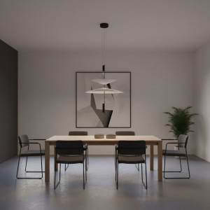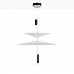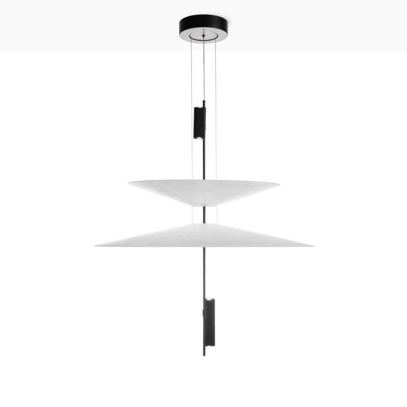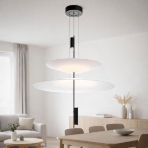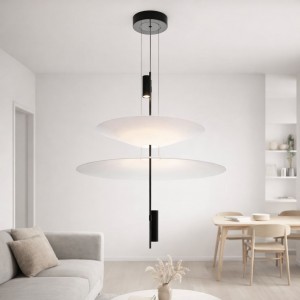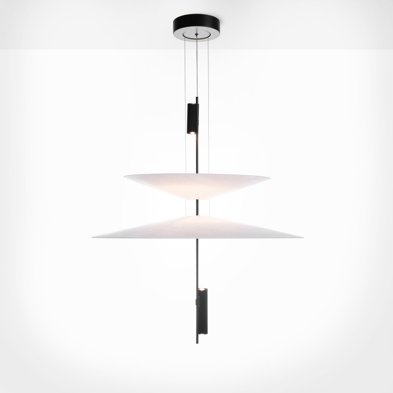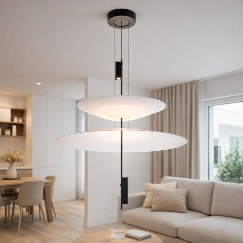 Cette lampe se distingue par son design architectural formé par des disques suspendus qui semblent flotter dans l'espace et qui, avec les spots LED intégrés, créent un éclairage précis, enveloppant et visuellement très léger.