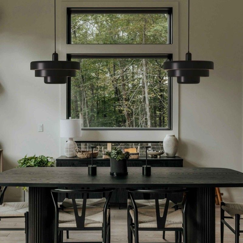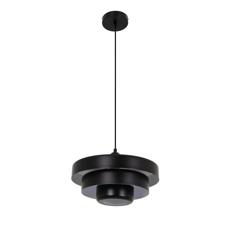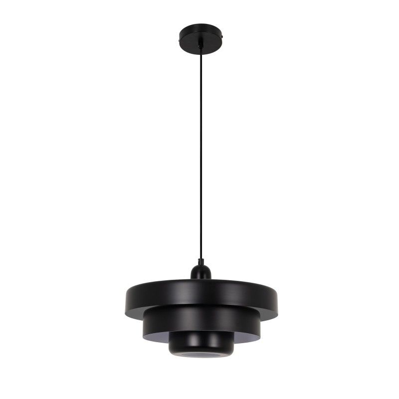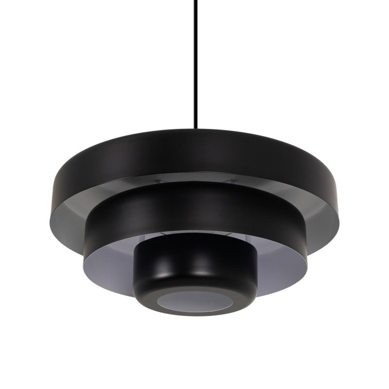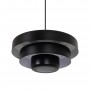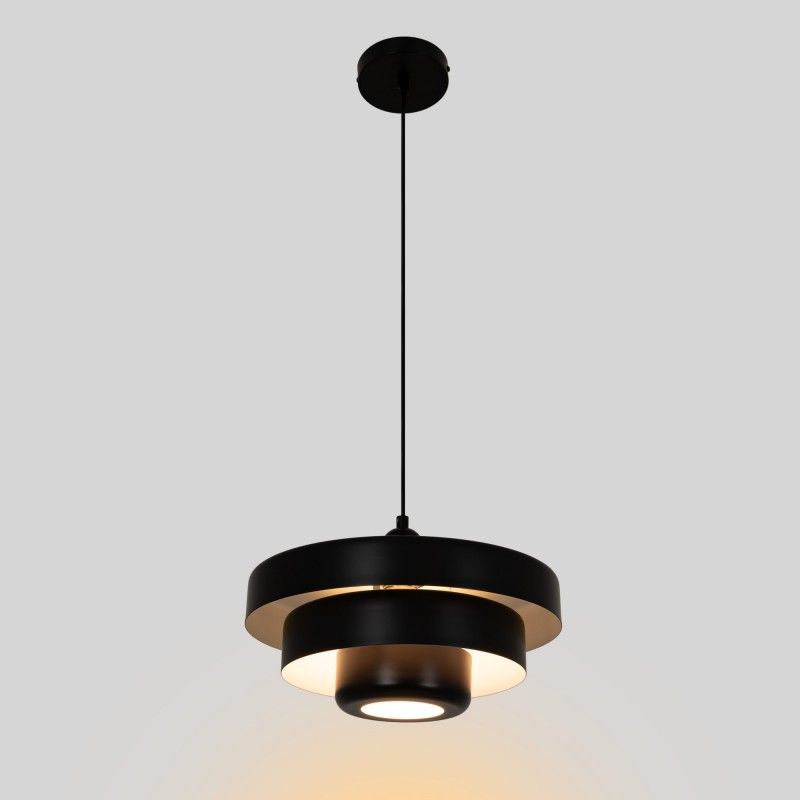 Cette lampe suspendue se distingue par son design distinctif, avec un abat-jour métallique sur trois niveaux qui donne de la profondeur à l'éclairage.