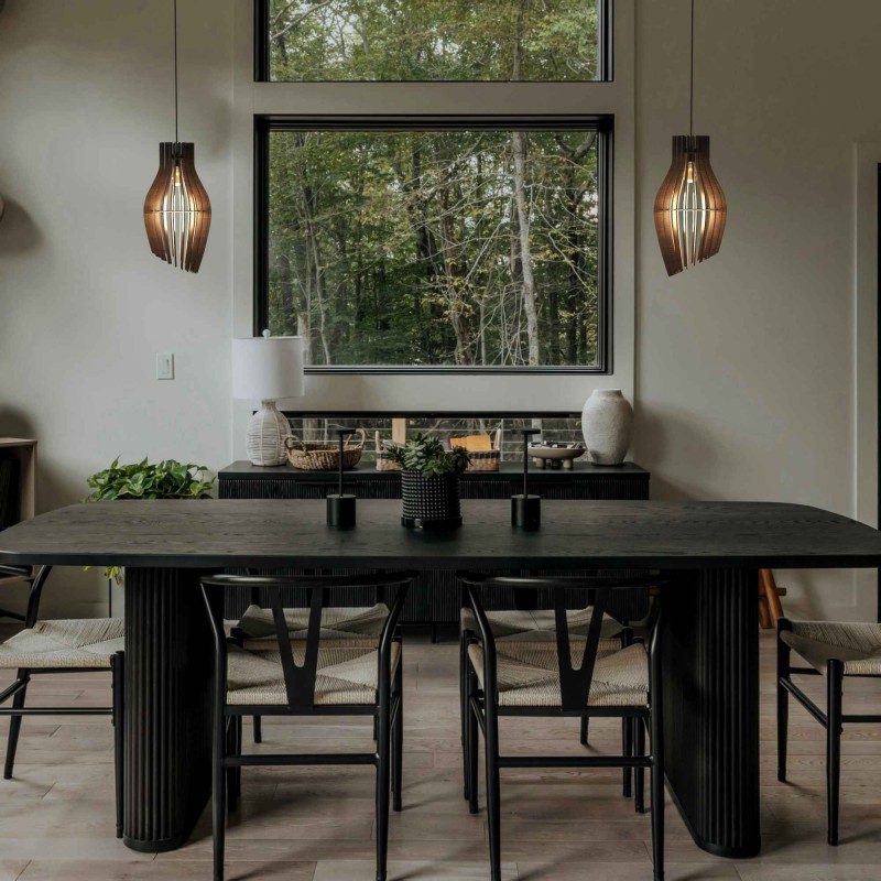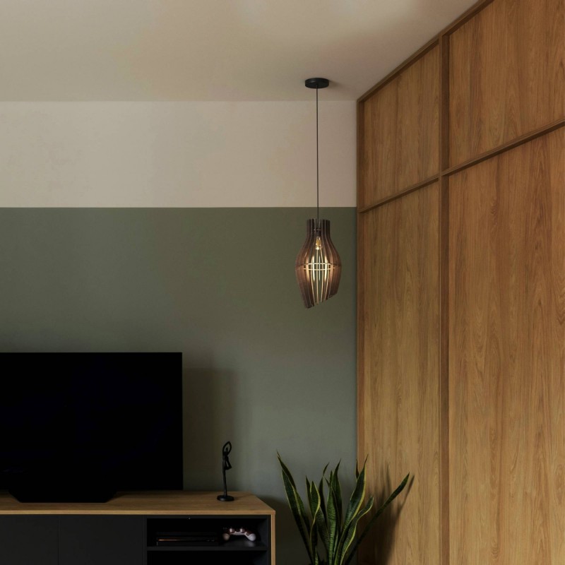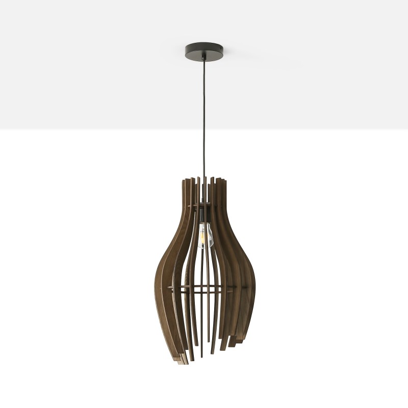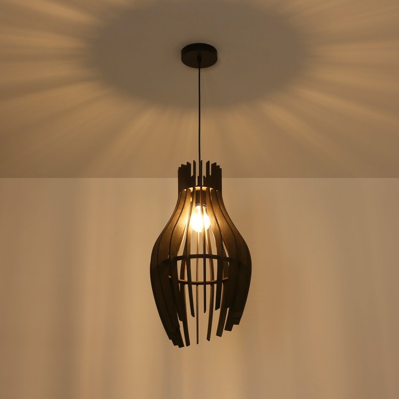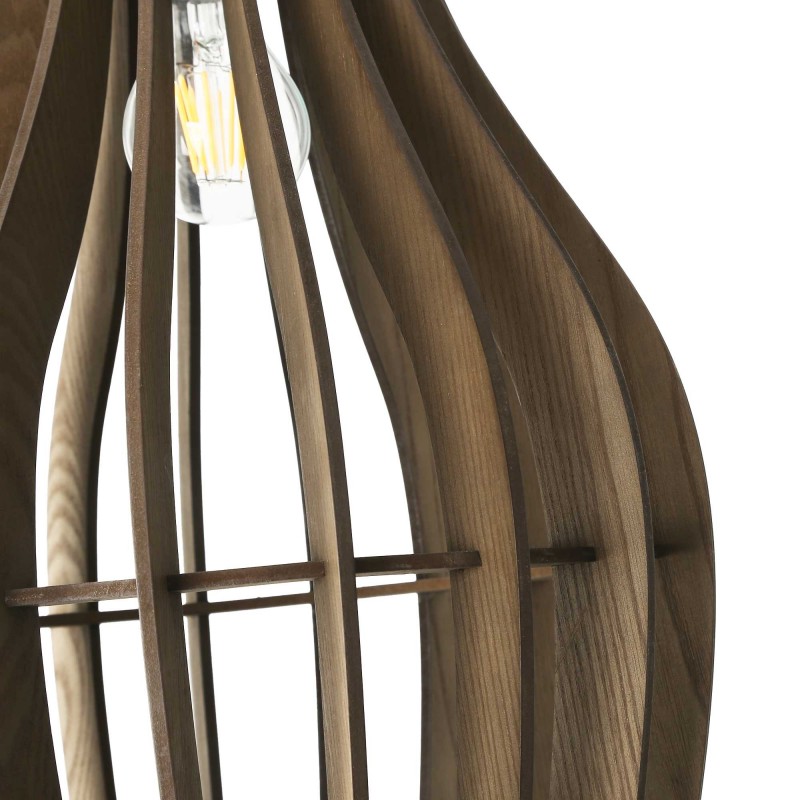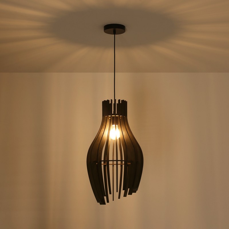 La lampe suspendue Huntel se distingue par son abat-jour original en bois MDF, au design allongé et irrégulier.