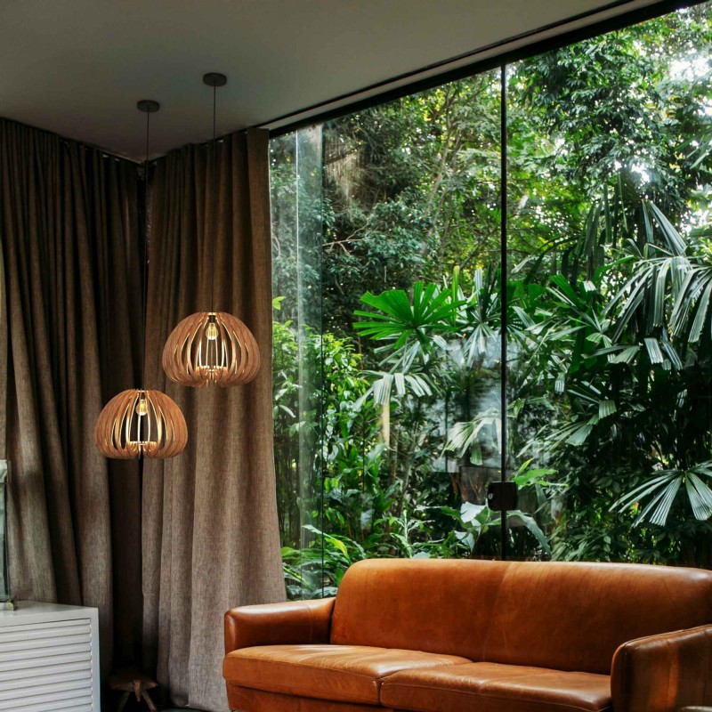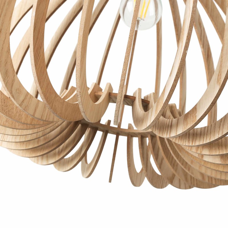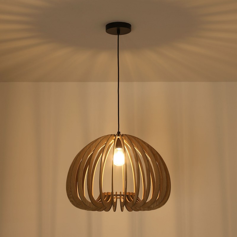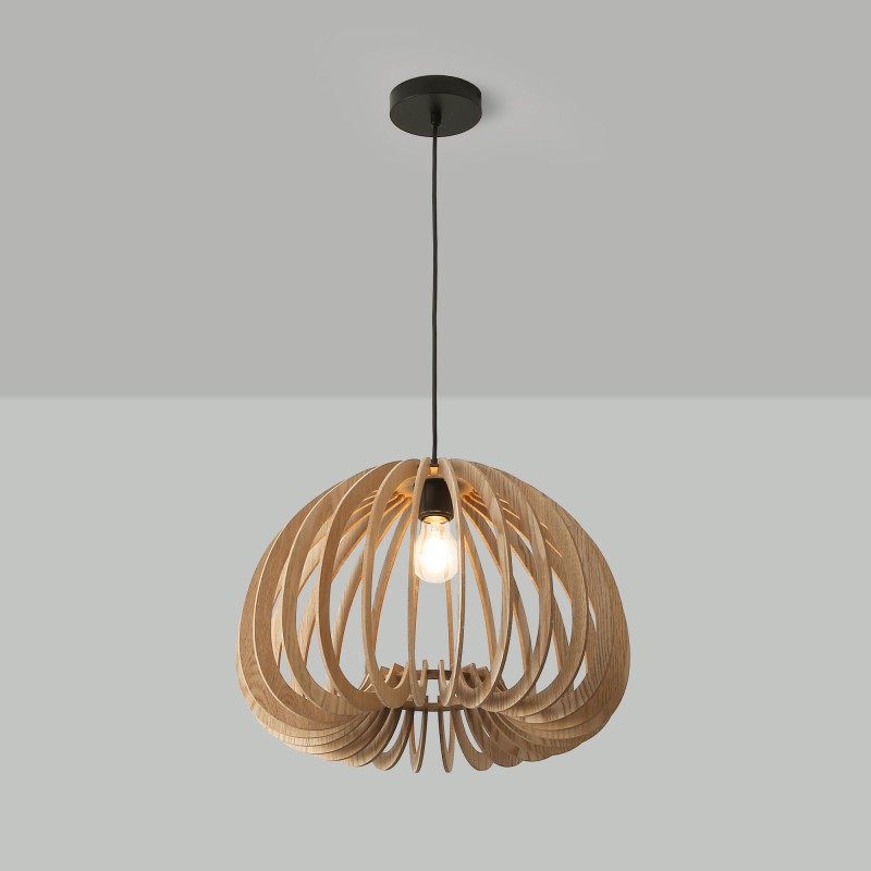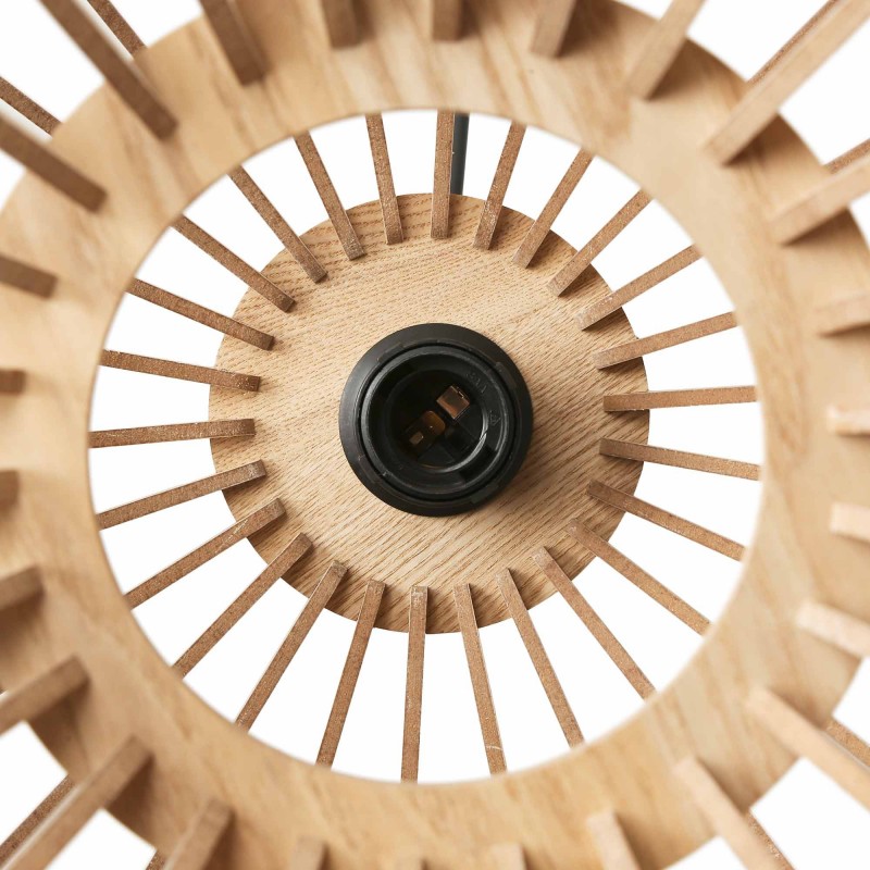 La lampe suspendue Marge se distingue par son design naturel et élégant, d'influence nordique et rustique. Fabriquée en lattes de bois MDF, elle permet à la lumière de se diffuser doucement, créant une atmosphère chaleureuse, parfaite pour toutes les pièces de la maison.