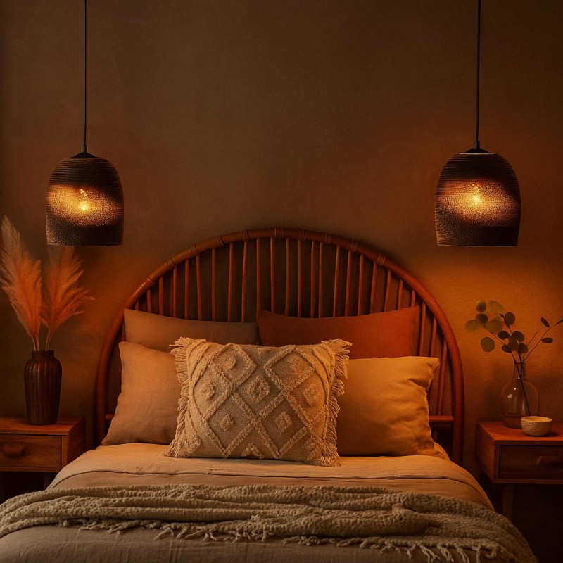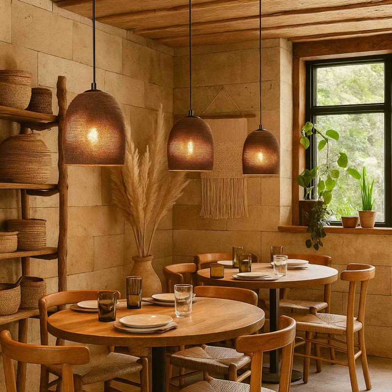 Lampe suspendue avec un design aux lignes fluides qui génère un effet visuel enveloppant. Parfaite pour les espaces qui recherchent une esthétique moderne, écologique et de caractère.