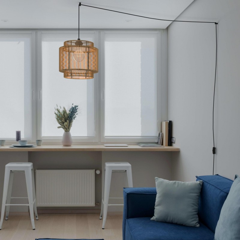 - Installation flexible : comprend un câble réglable avec deux crochets de décentralisation pour différentes configurations. Comprend un interrupteur et une prise Schuko, idéale pour les espaces sans point lumineux à proximité. Disponible en noir, blanc et corde naturelle.