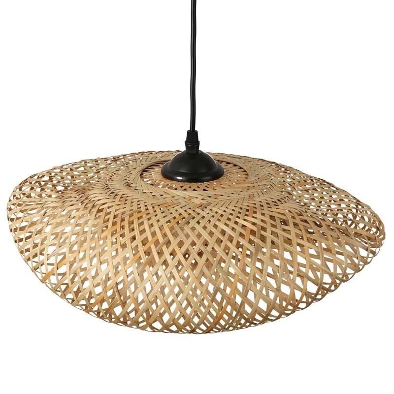 Lampe suspendue en tressage d'osier, formant une forme ovale irrégulière. Au centre de la lampe se trouve un support pour accueillir une ampoule LED E27 (non incluse).