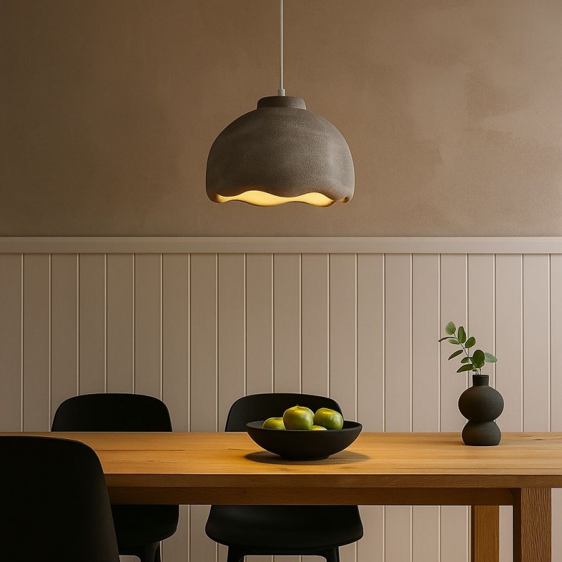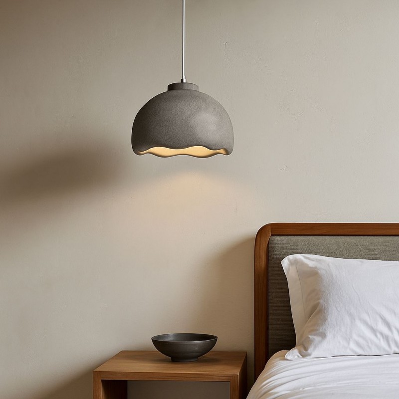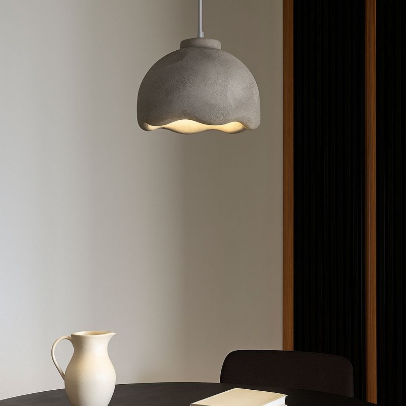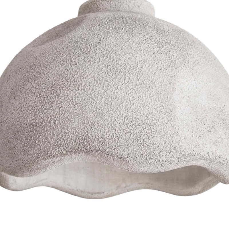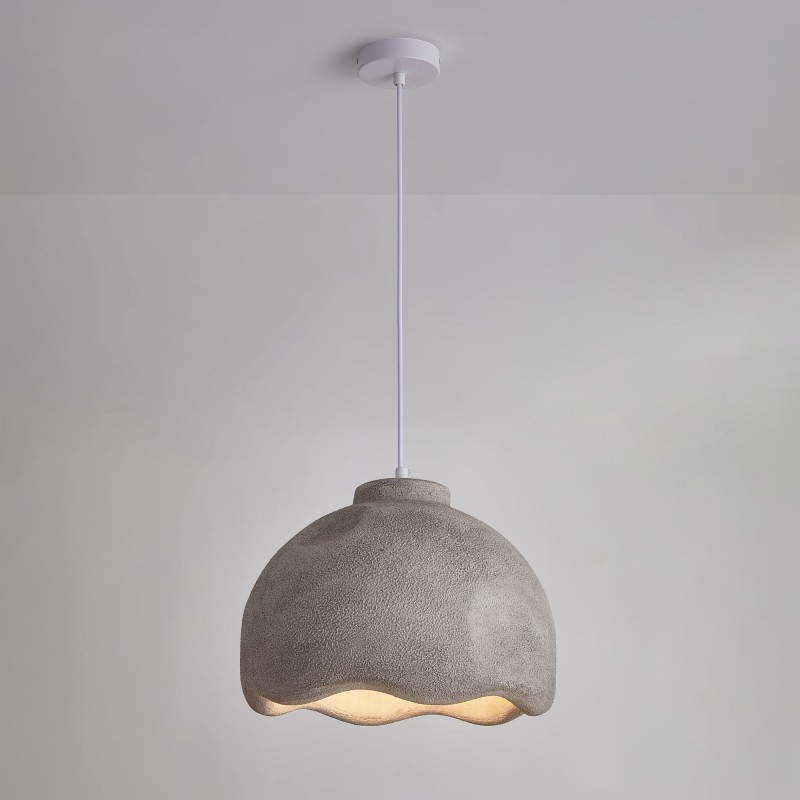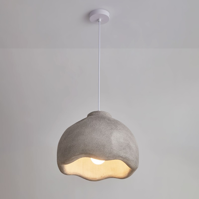 Lampe suspendue en résine avec une finition rugueuse et des bords ondulés. Son design artisanal et ses tons neutres apportent calme et harmonie visuelle à tout environnement.
