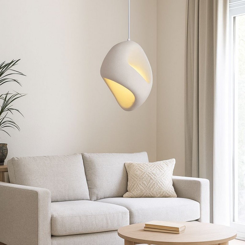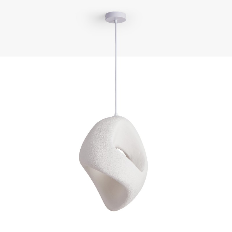 Lampe suspendue en résine avec une finition blanche texturée. Une pièce unique qui transmet chaleur et caractère organique.