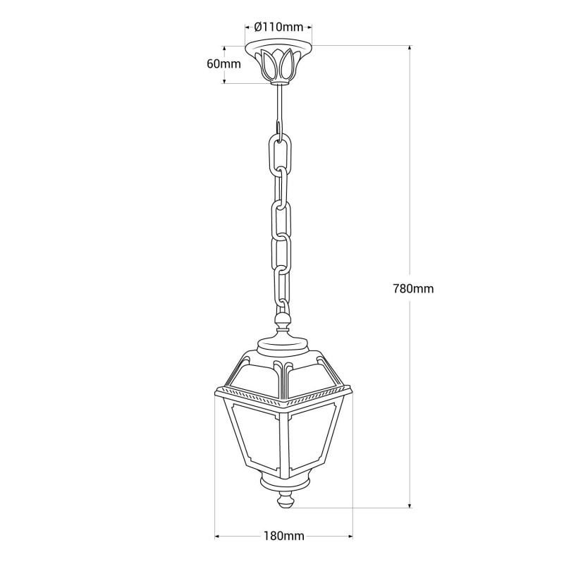 Cette lanterne suspendue par une chaîne présente un design classique et un indice de protection IP55, qui la rend apte à être installée sur des plafonds extérieurs et résistante aux facteurs externes tels que la poussière et l'humidité.