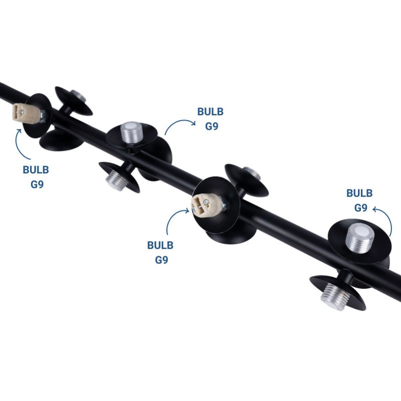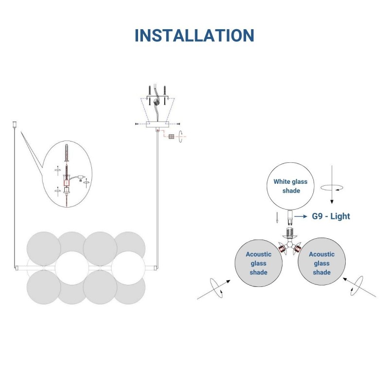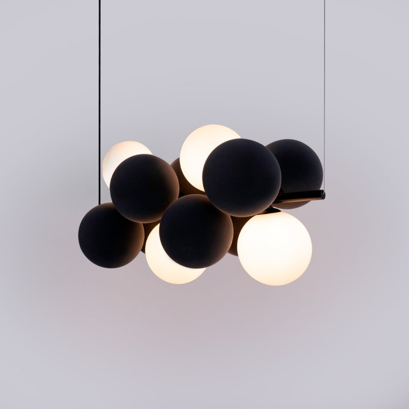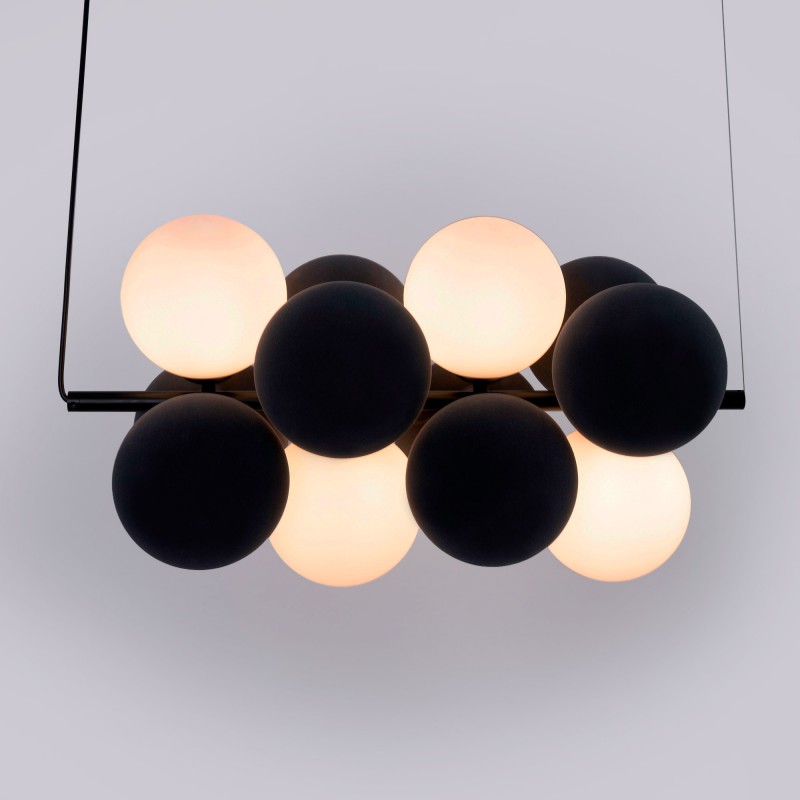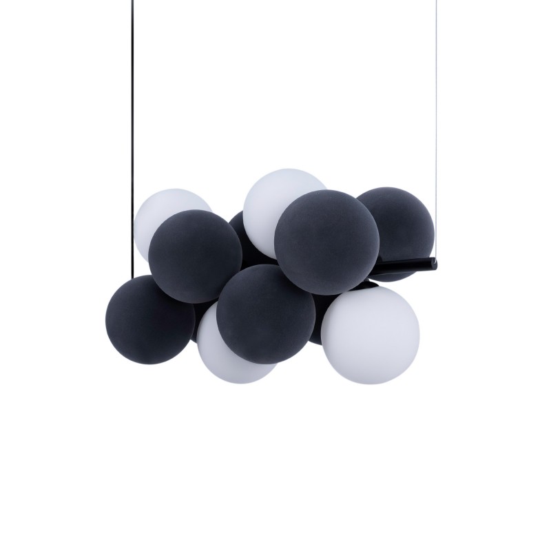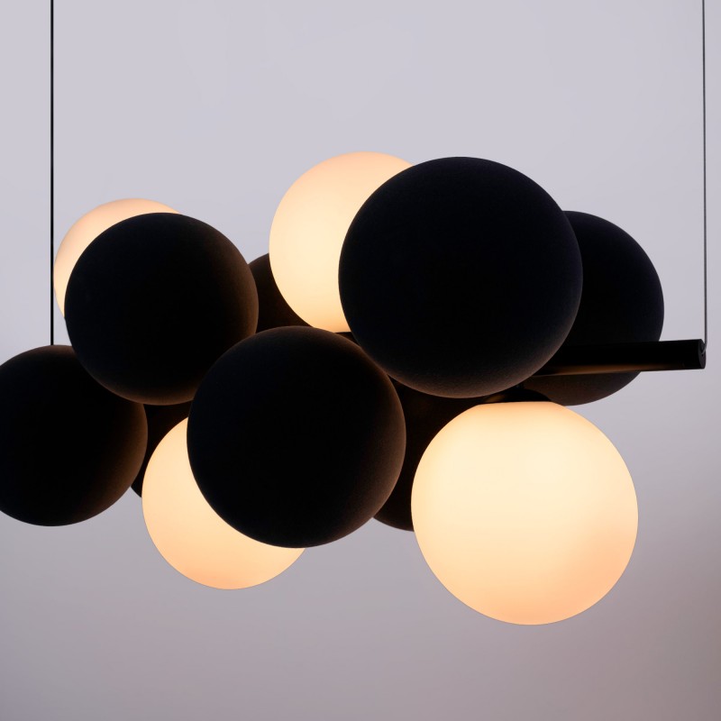 Inspirée par l'essence de l'abstrait, cette pièce présente un design horizontal, composé de 12 globes de Ø140mm chacun : 4 globes lumineux (ampoules G9) en verre opale et 8 absorbeurs recouverts d'une housse textile acoustique, disponible en gris ou en marron.
