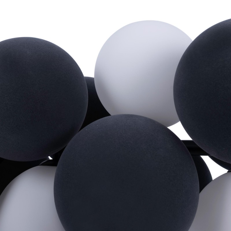 Les sphères lumineuses en verre opalin diffusent une lumière douce et enveloppante, créant une atmosphère décontractée et moderne. Le design horizontal permet une distribution uniforme de la lumière, soulignant l'élégance des formes abstraites et créant un jeu d'ombres fascinant.