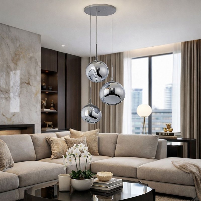 - Installation facile : Les globes en verre sont suspendus à une rosace centrale et maintenus par des filins transparents réglables en hauteur, ce qui simplifie l'installation.