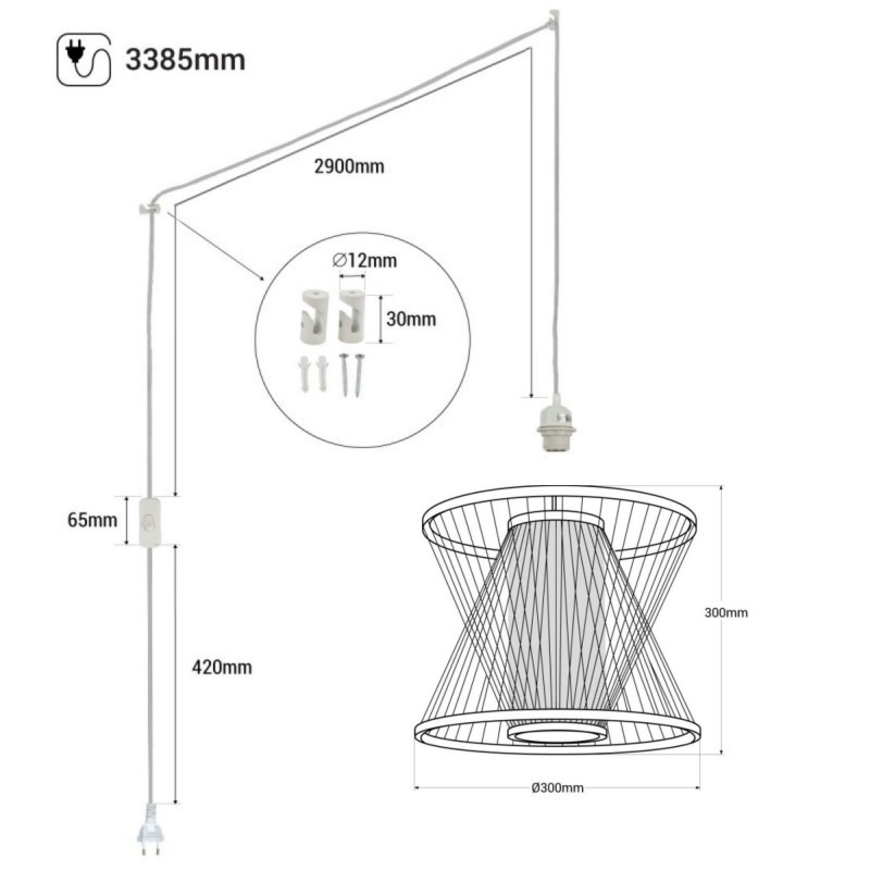 La lampe est livrée avec un câble de 3,38 mètres de long équipé d'un interrupteur et d'une prise, ainsi que de deux crochets de décentralisation pour une installation et un ajustement personnalisés.