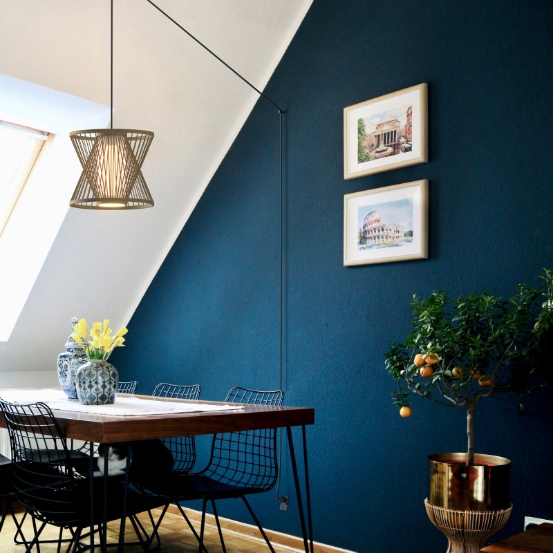 La lampe suspendue peut être utilisée avec n'importe quelle ampoule E27 d'une puissance maximale de 60W (non incluse) et elle est disponible avec trois couleurs de câble différentes (blanc, noir et corde naturelle), afin de s'harmoniser avec l'environnement dans lequel elle sera installée.