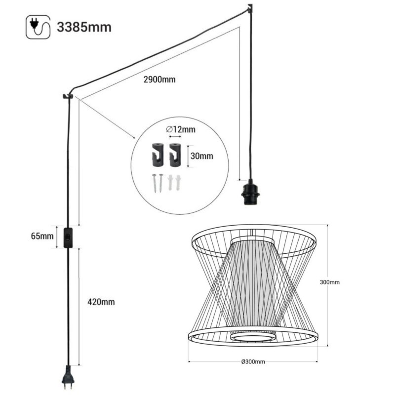 La lampe comprend un câble réglable au moyen de deux crochets décentralisateurs qui permettent différentes configurations d'installation. Le câble intègre un interrupteur sur son parcours et une prise standard de type Schuko à son extrémité, facilitant ainsi l'installation de la lampe dans des endroits où il n'y a pas de point lumineux à proximité.