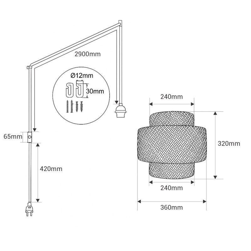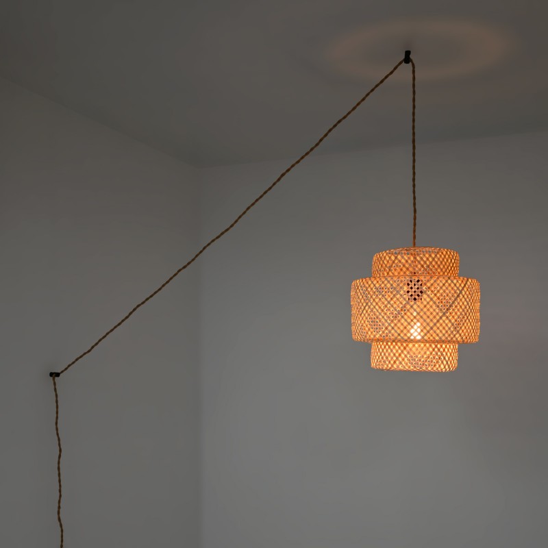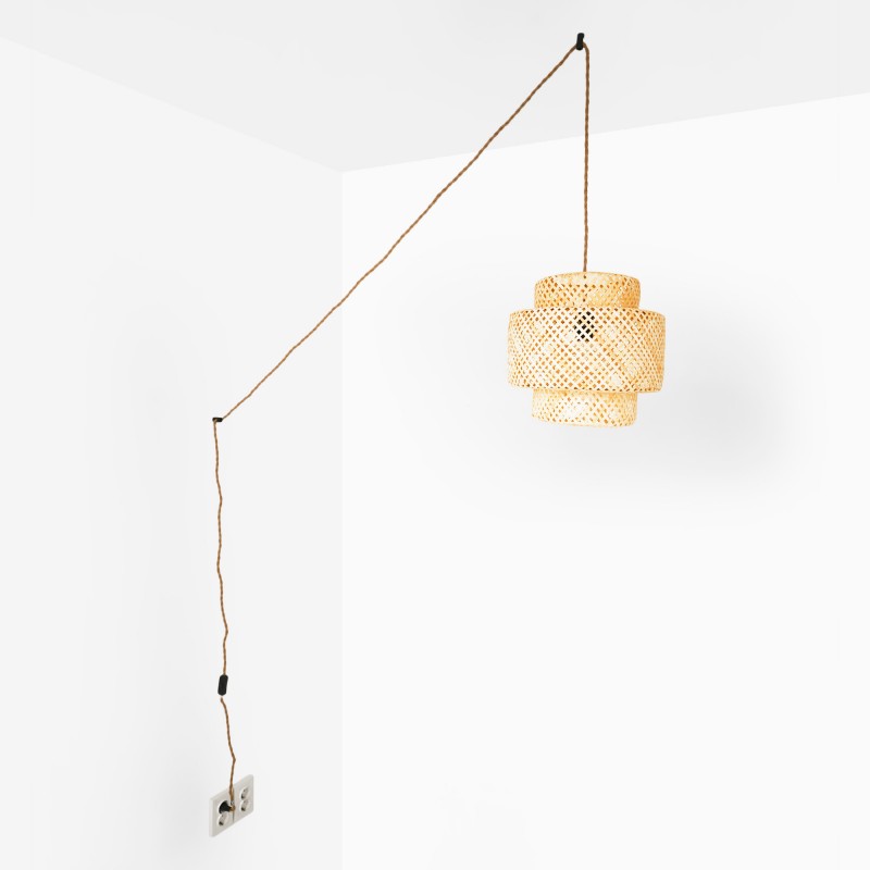 • Installation flexible : comprend un câble réglable avec deux crochets de décentralisation pour différentes configurations. Comprend un interrupteur et une prise Schuko, idéale pour les espaces sans point lumineux à proximité. Disponible en noir, blanc et corde naturelle.